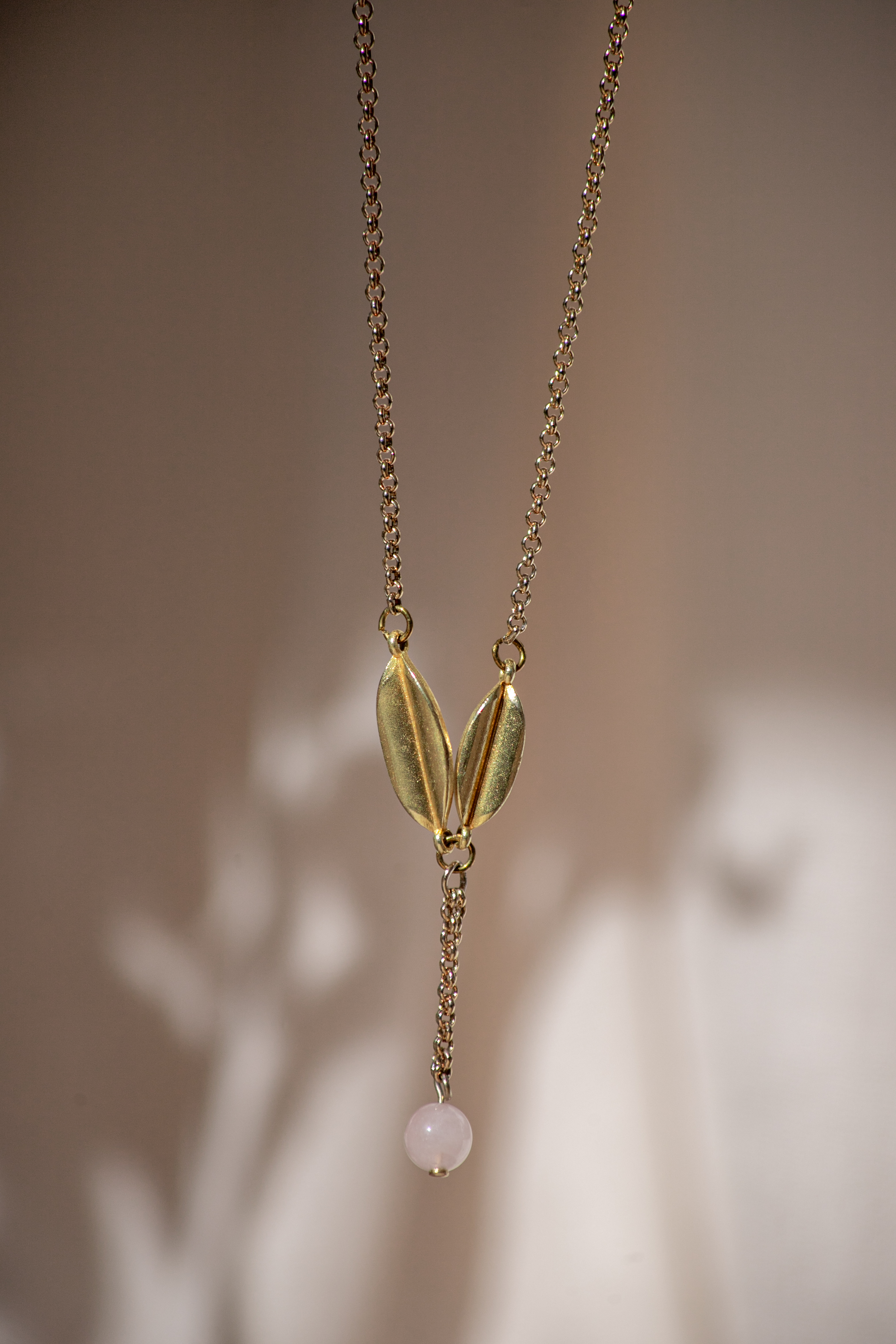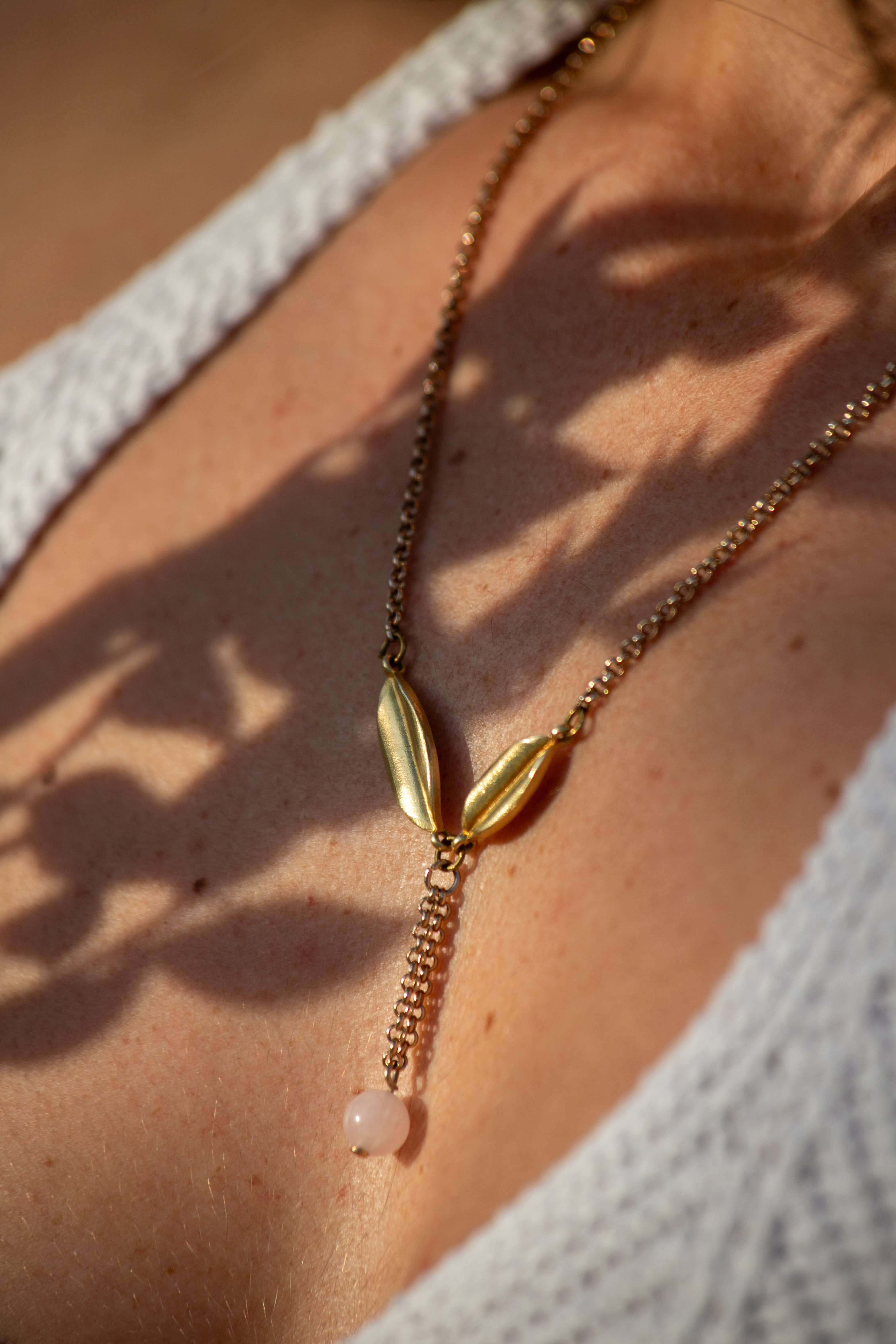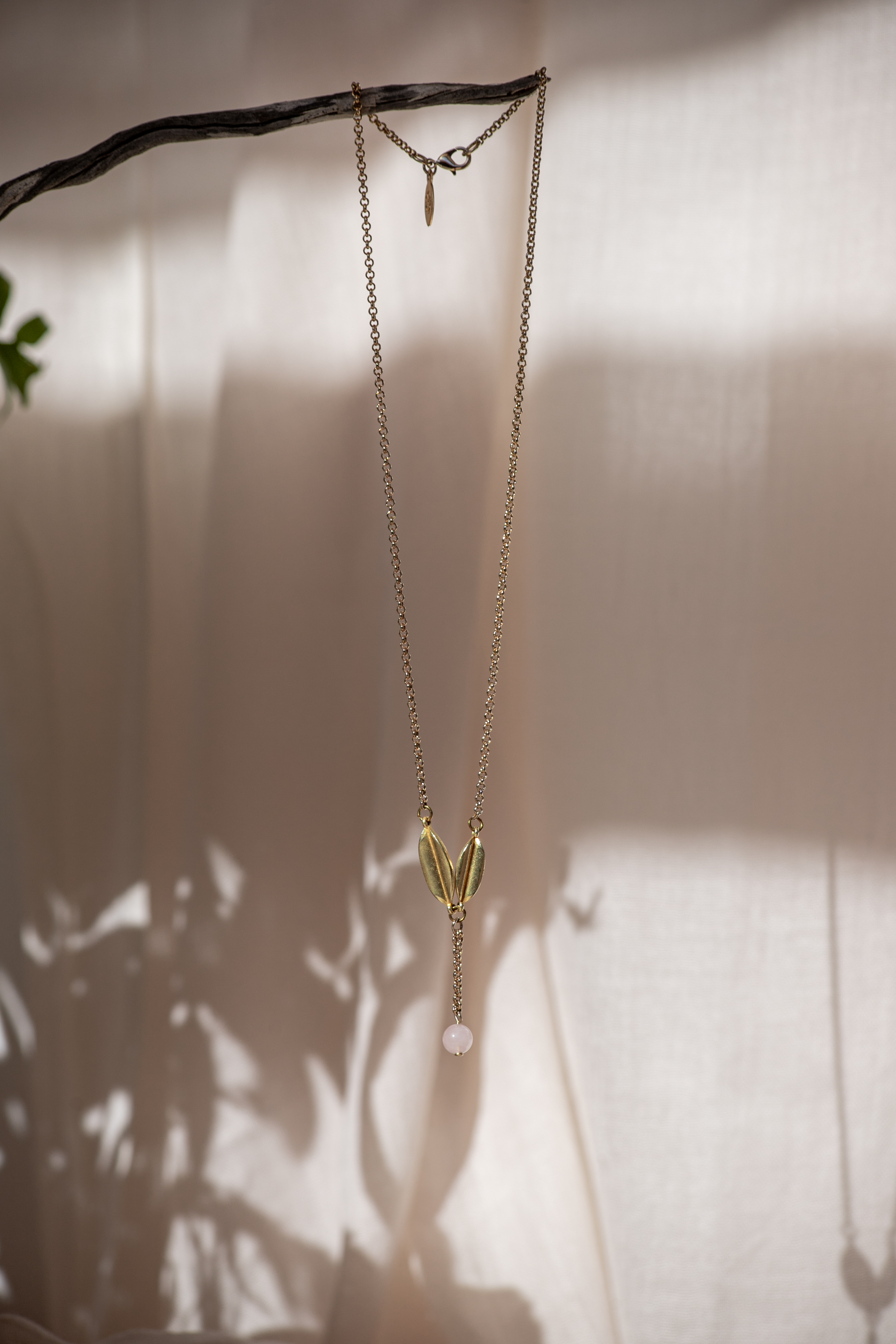 Short necklace with brass chain and pendant featuring a smooth rose quartz stone sprouting two brass leaves.
