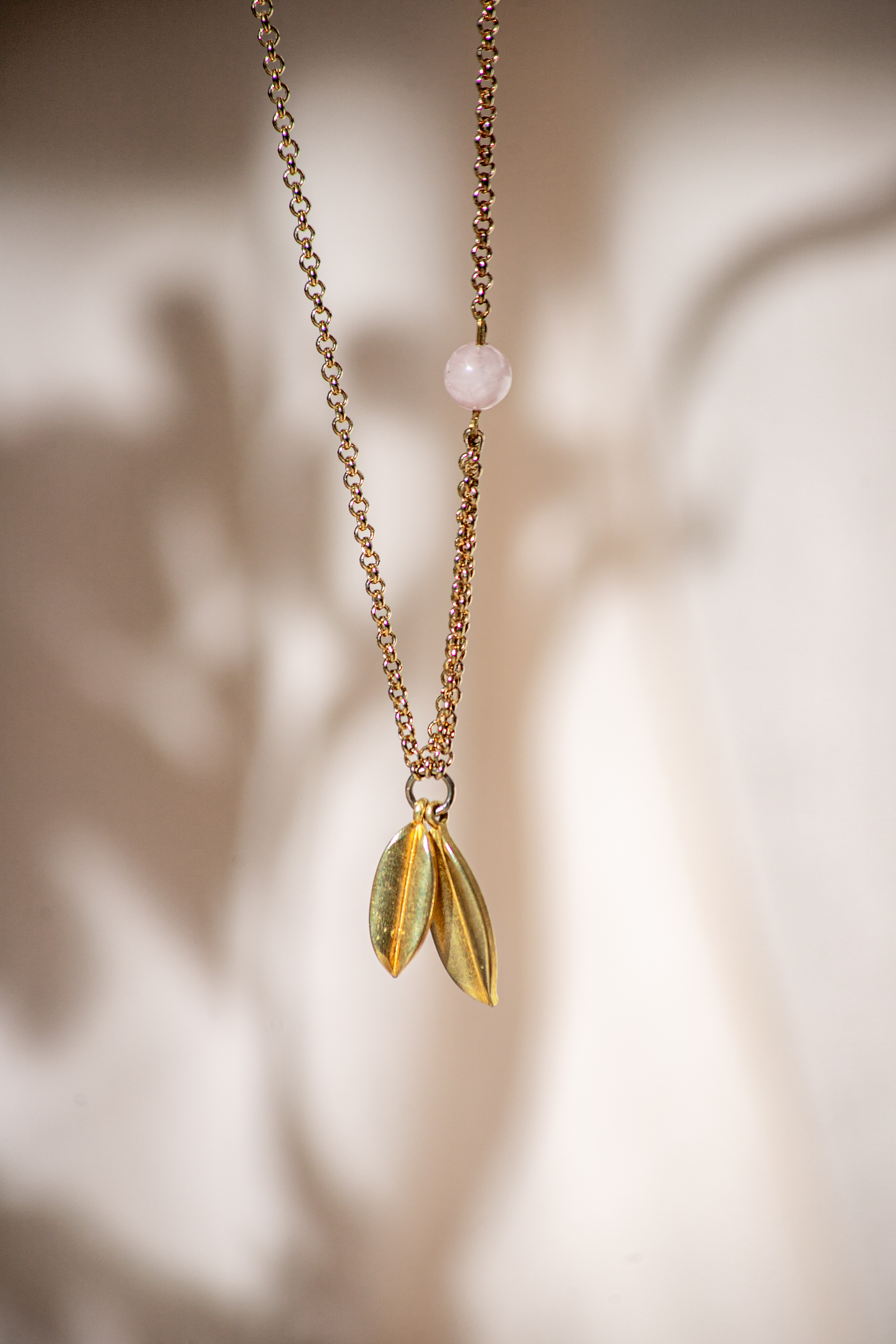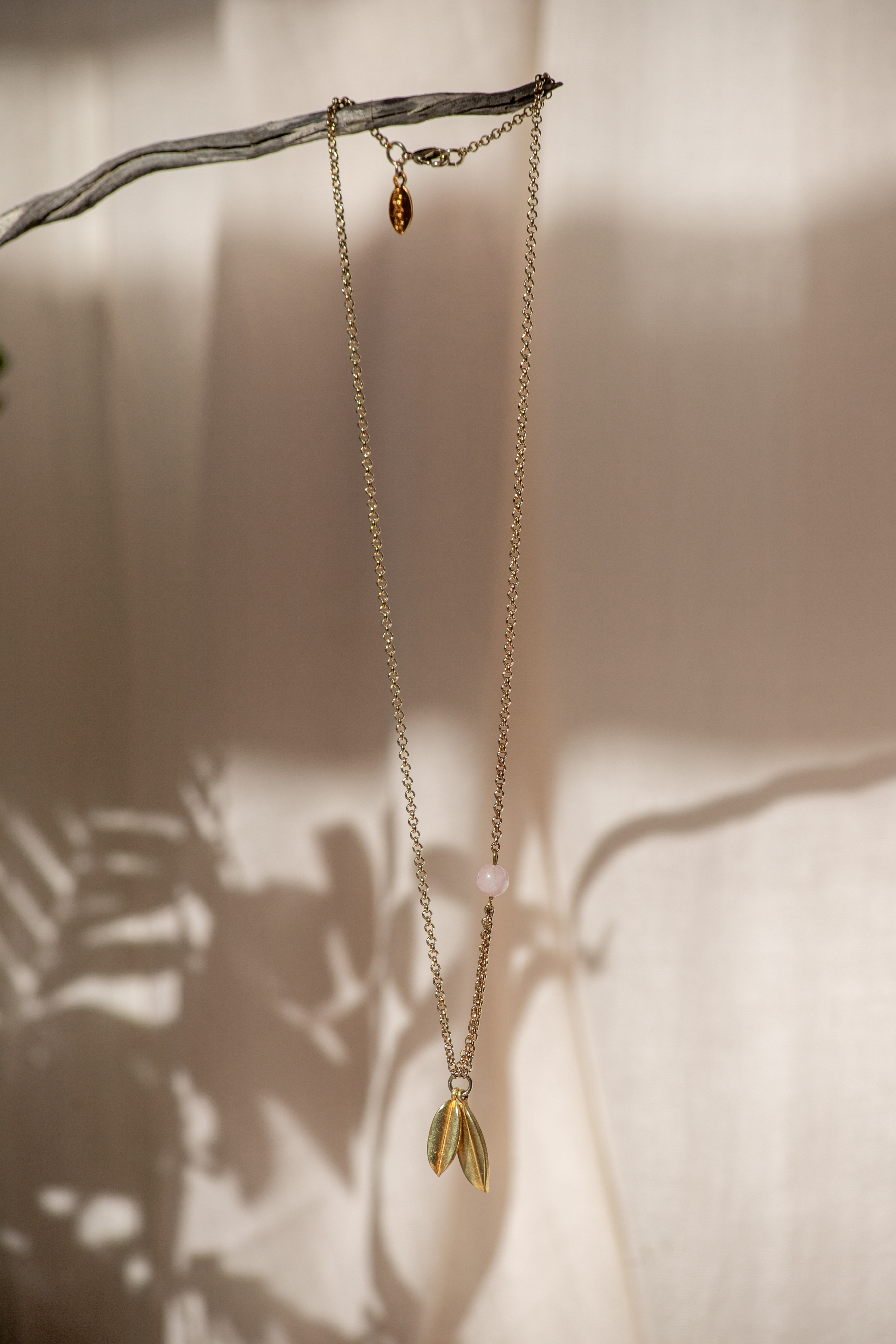 Short necklace with chain and two brass leaves sprouting from a smooth-cut rose quartz stone.