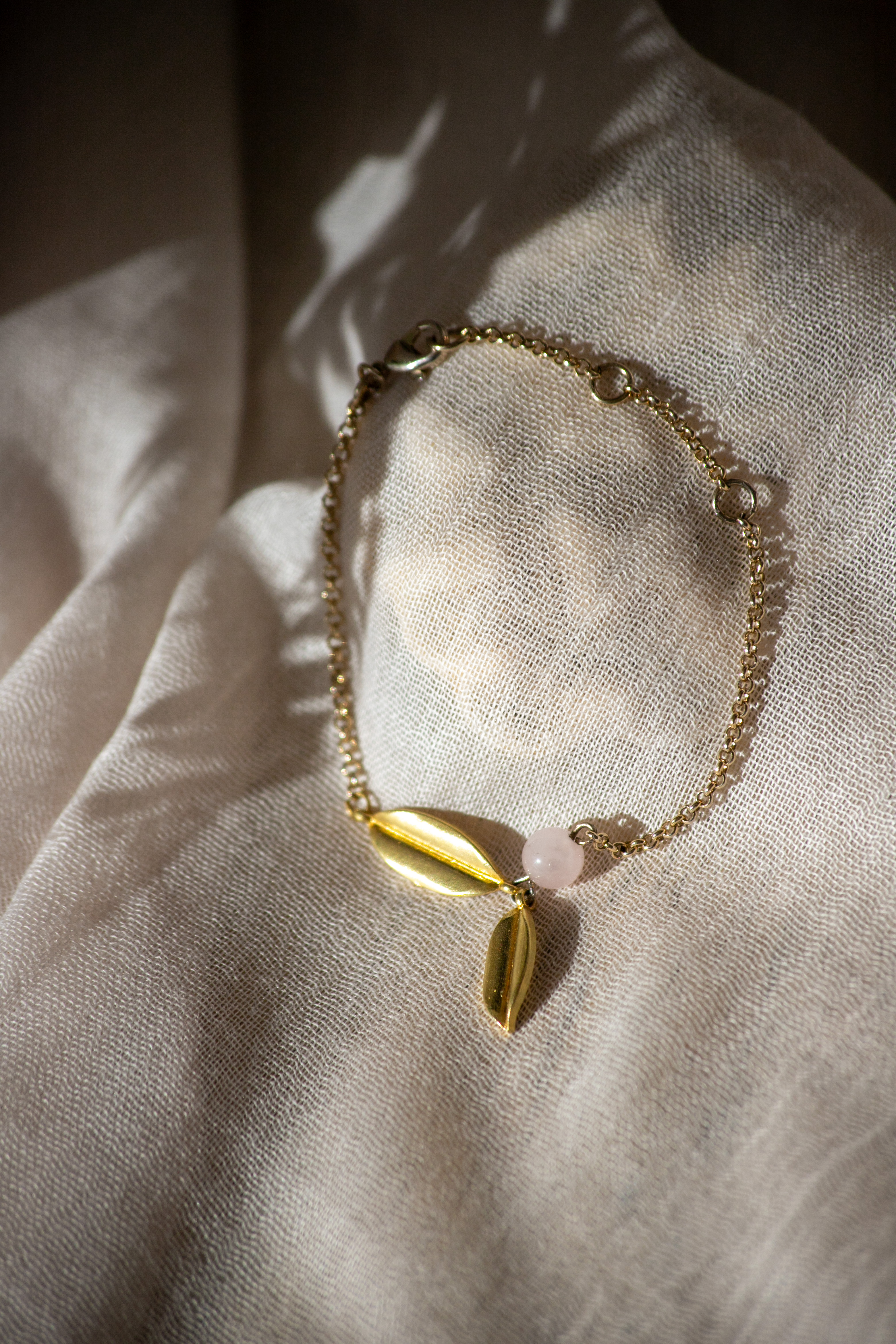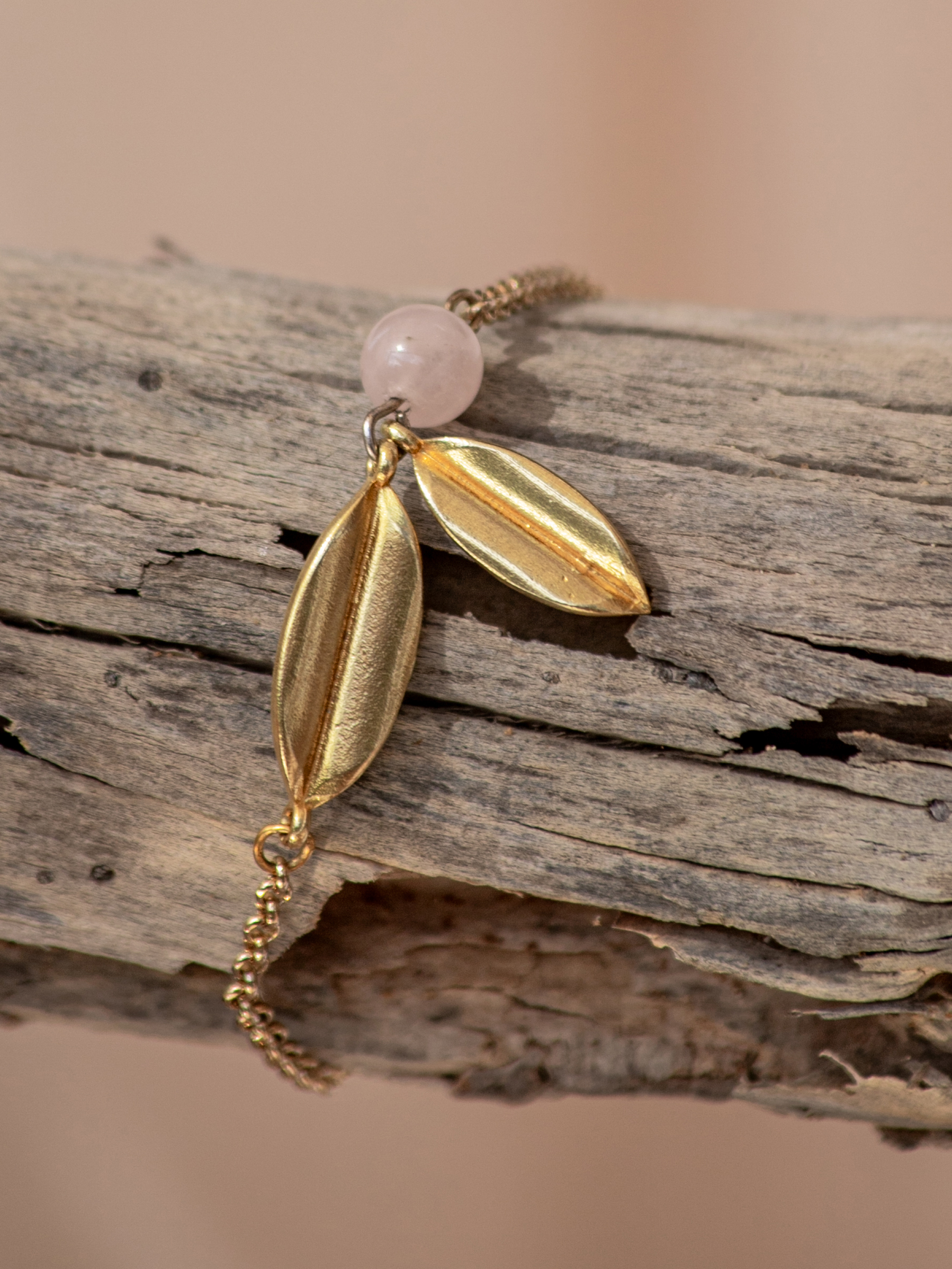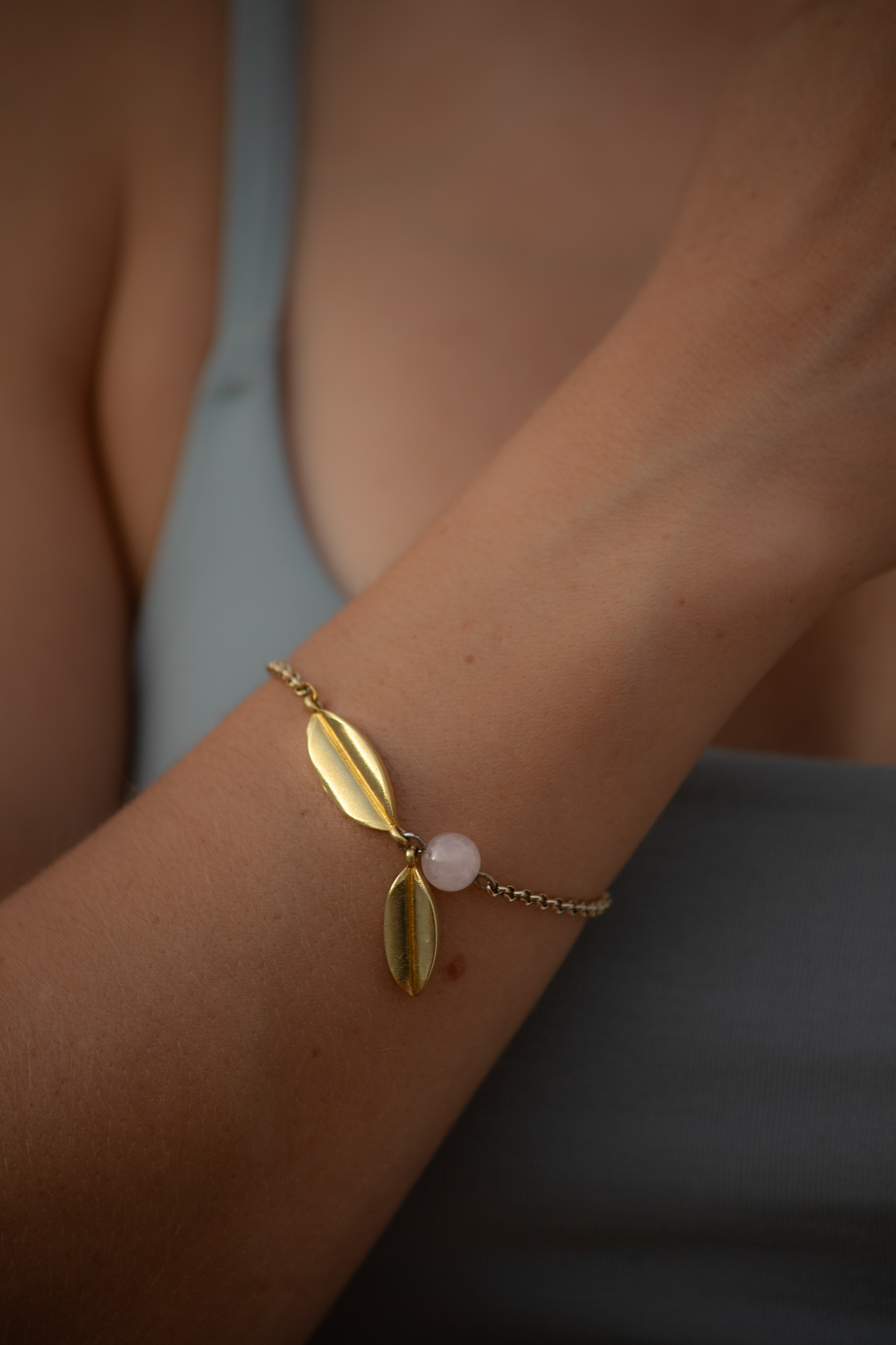Bracciale con catena e due foglie in ottone, che germogliano da una pietra quarzo rosa dal taglio liscio
