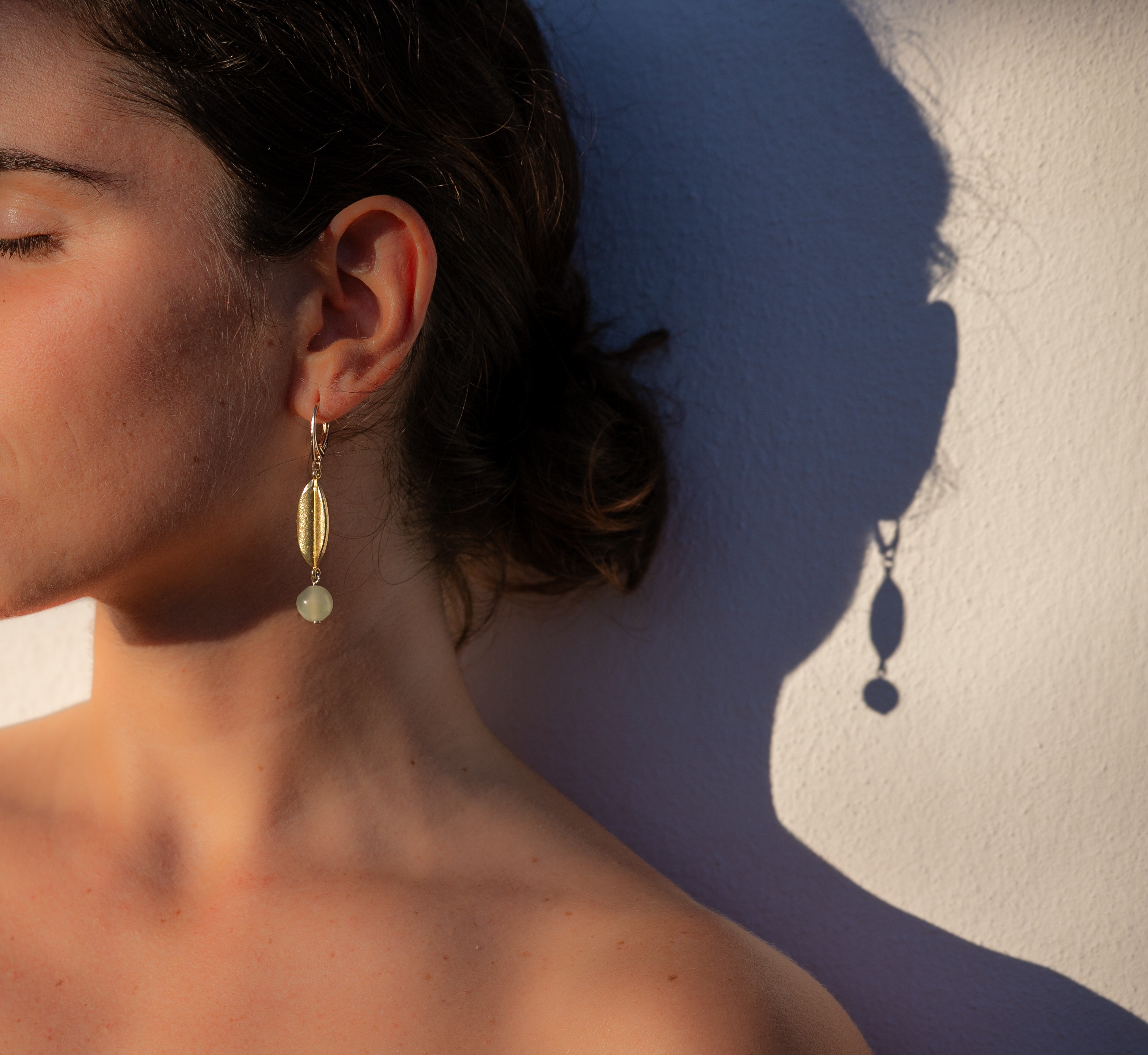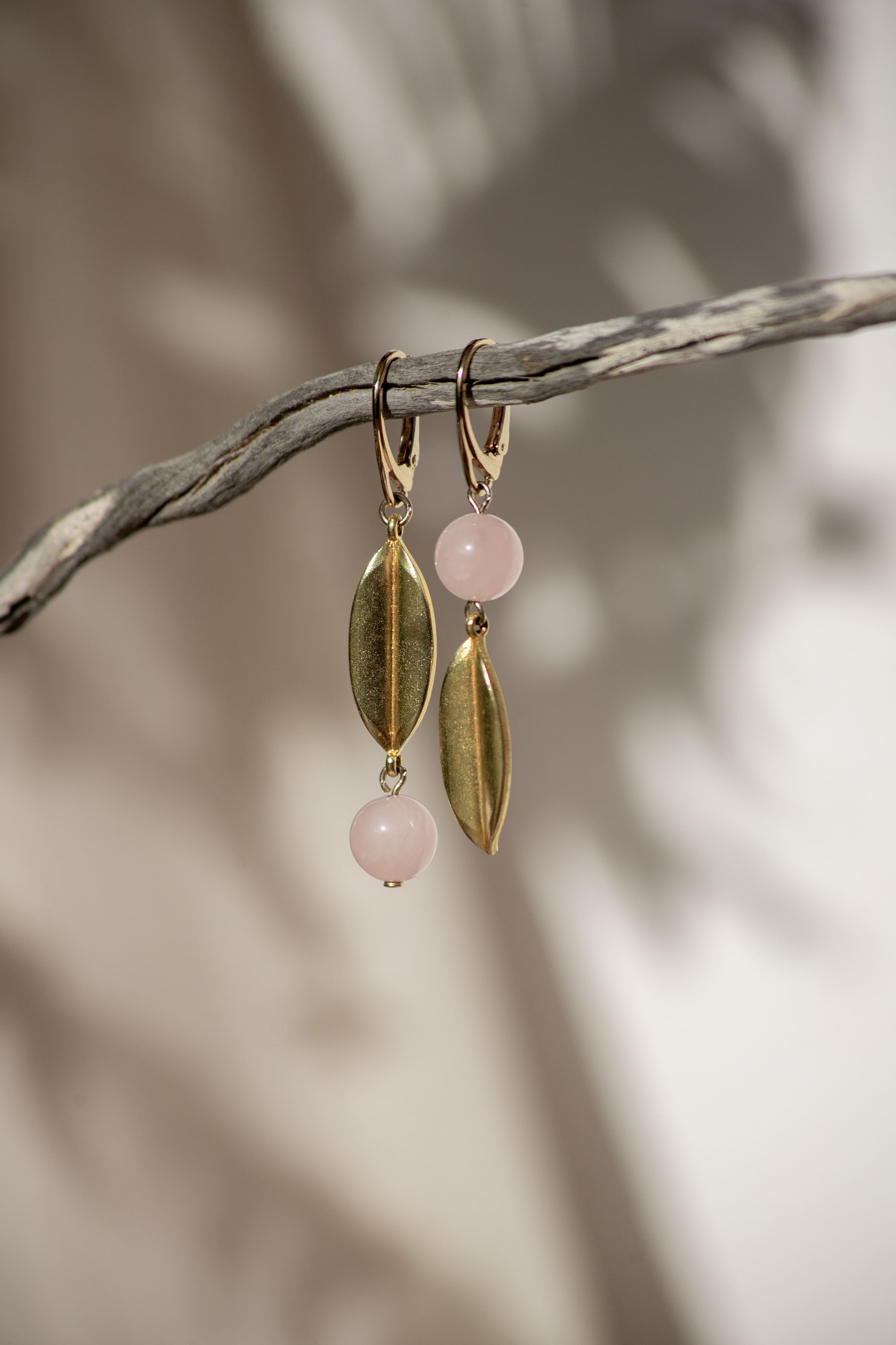 Orecchini con una foglia in ottone, che germoglia da una pietra quarzo rosa dal taglio liscio.
