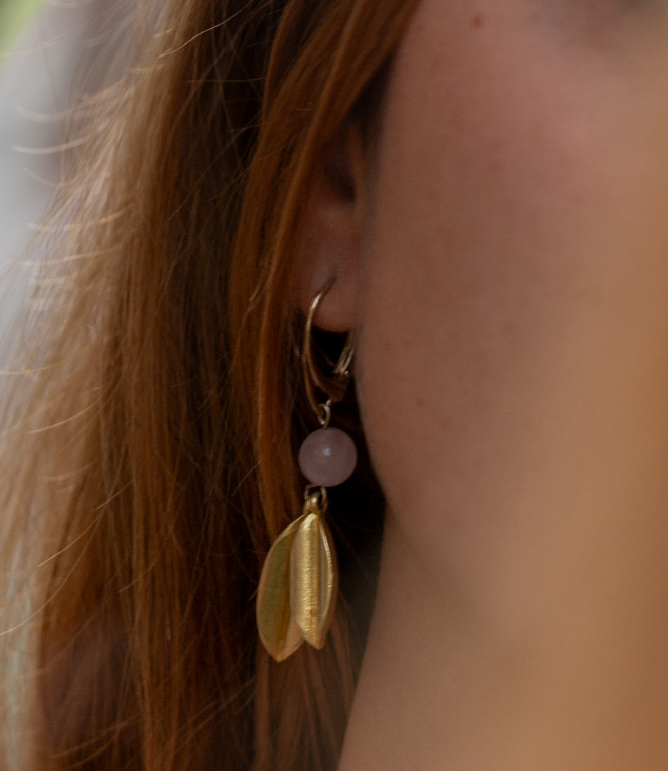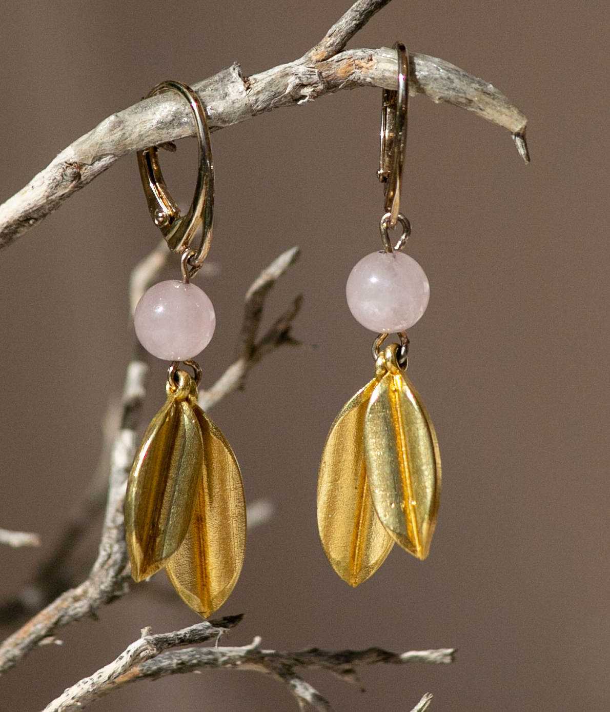Orecchini con due foglie in ottone, che germogliano da una pietra quarzo rosa dal taglio liscio